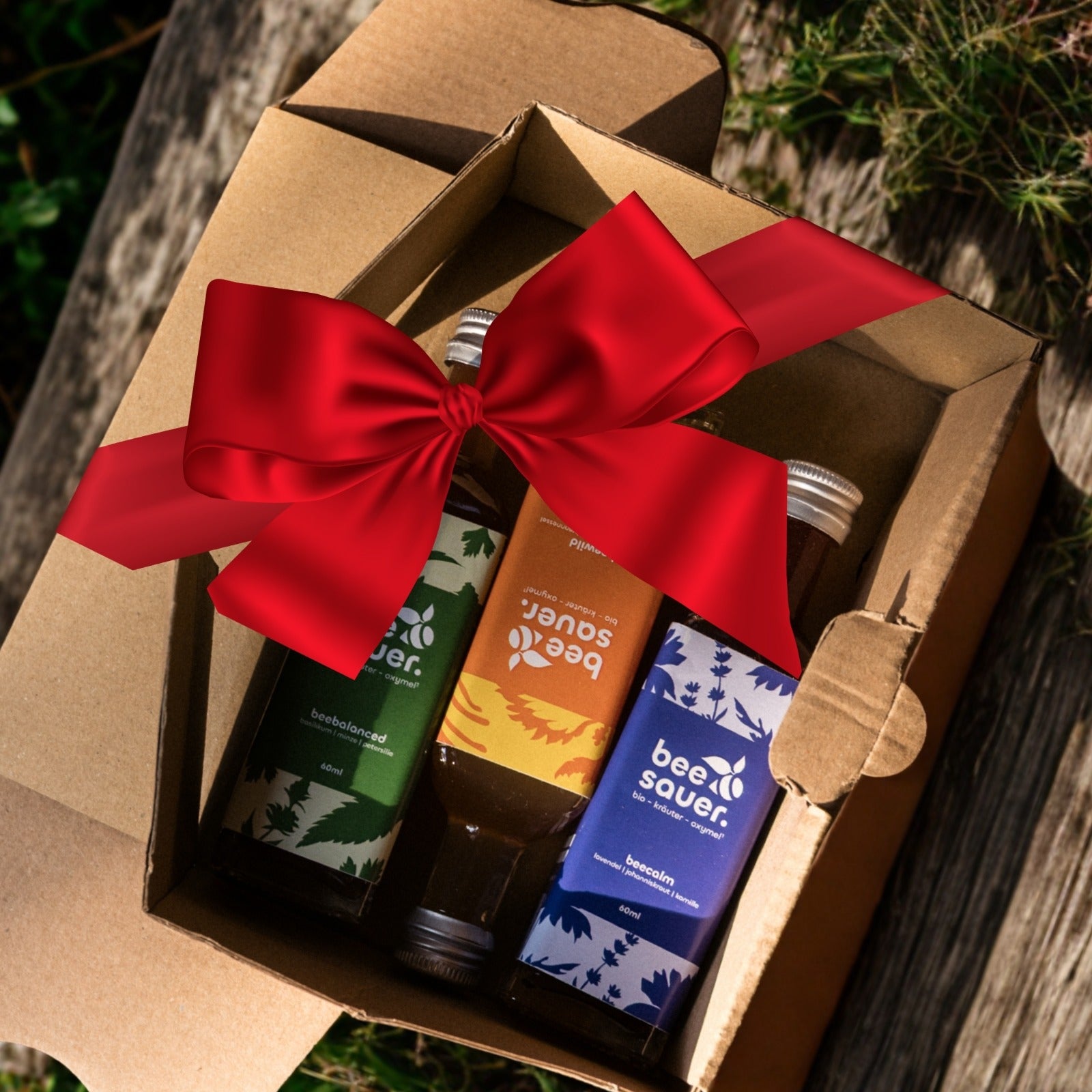 beecalm: Sanft mild-fruchtig mit einer blumigen Note. Aroniaessig trifft auf Lavendel und Kamille, abgerundet durch Johanniskraut. Das perfekte Abendritual.