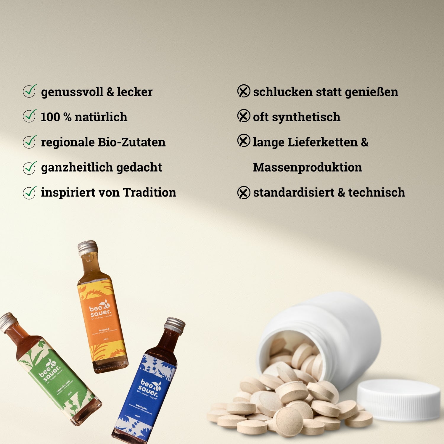 Wir haben dieses Konzept neu gedacht – und daraus ist beesauer entstanden: Ein natürlicher Drink, modern interpretiert und regional produziert. Dein natürlicher Unterstützer mit der Kraft der Kräuter.